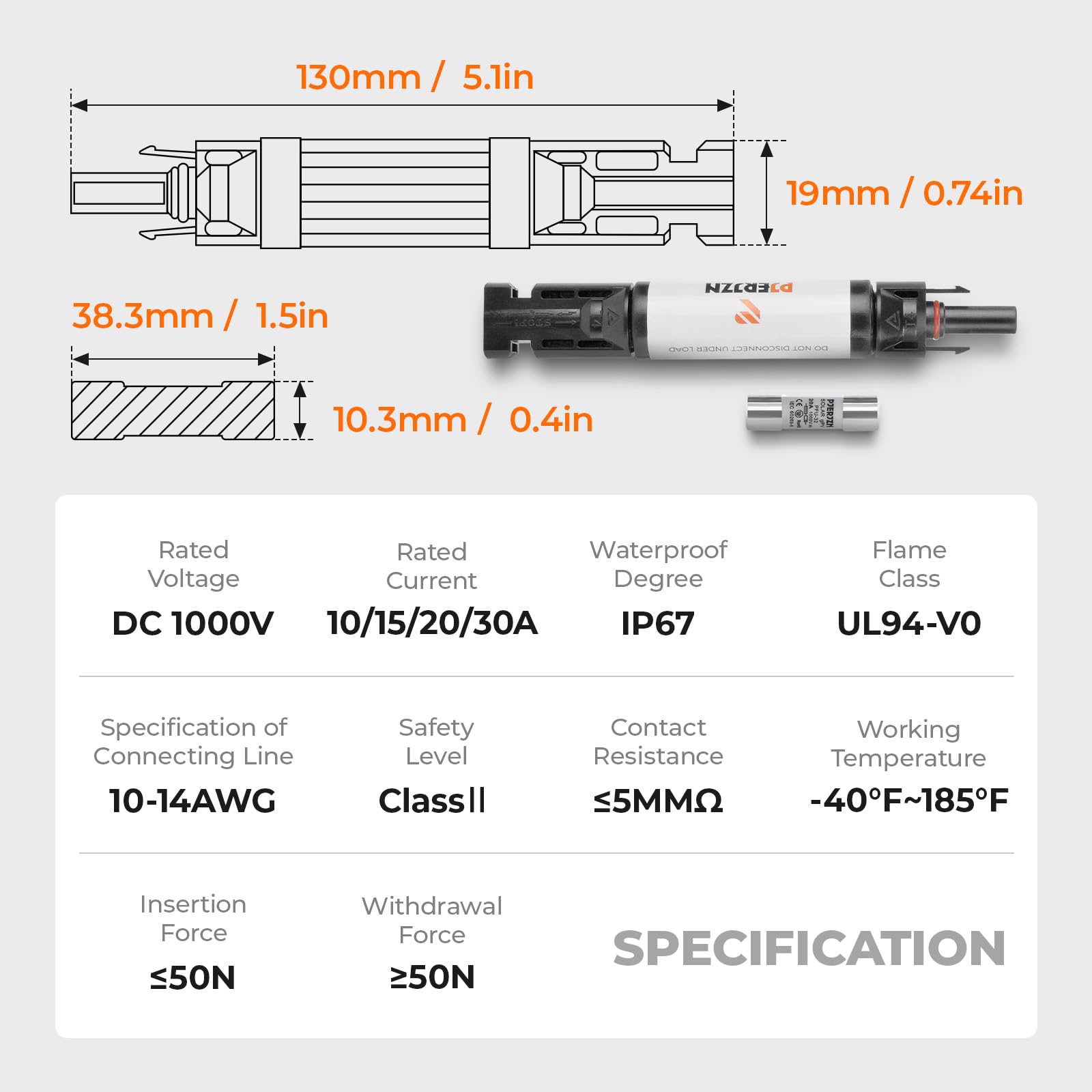 - High-Quality Material: The Solar Panel Fuse is wrapped with a high-quality insulating PC/PPO shell, Ensuring a reliable inline solar fuse lower than 5mΩ resistance and UL94-V0 flame resistance, It’s worth mentioning that, due to the material upgrade, the Temperature range of PJERJZN solar fuse Can withstand higher temperature differences than other solar fuses temperatures from -40° ~ +105°, Quality reliability.