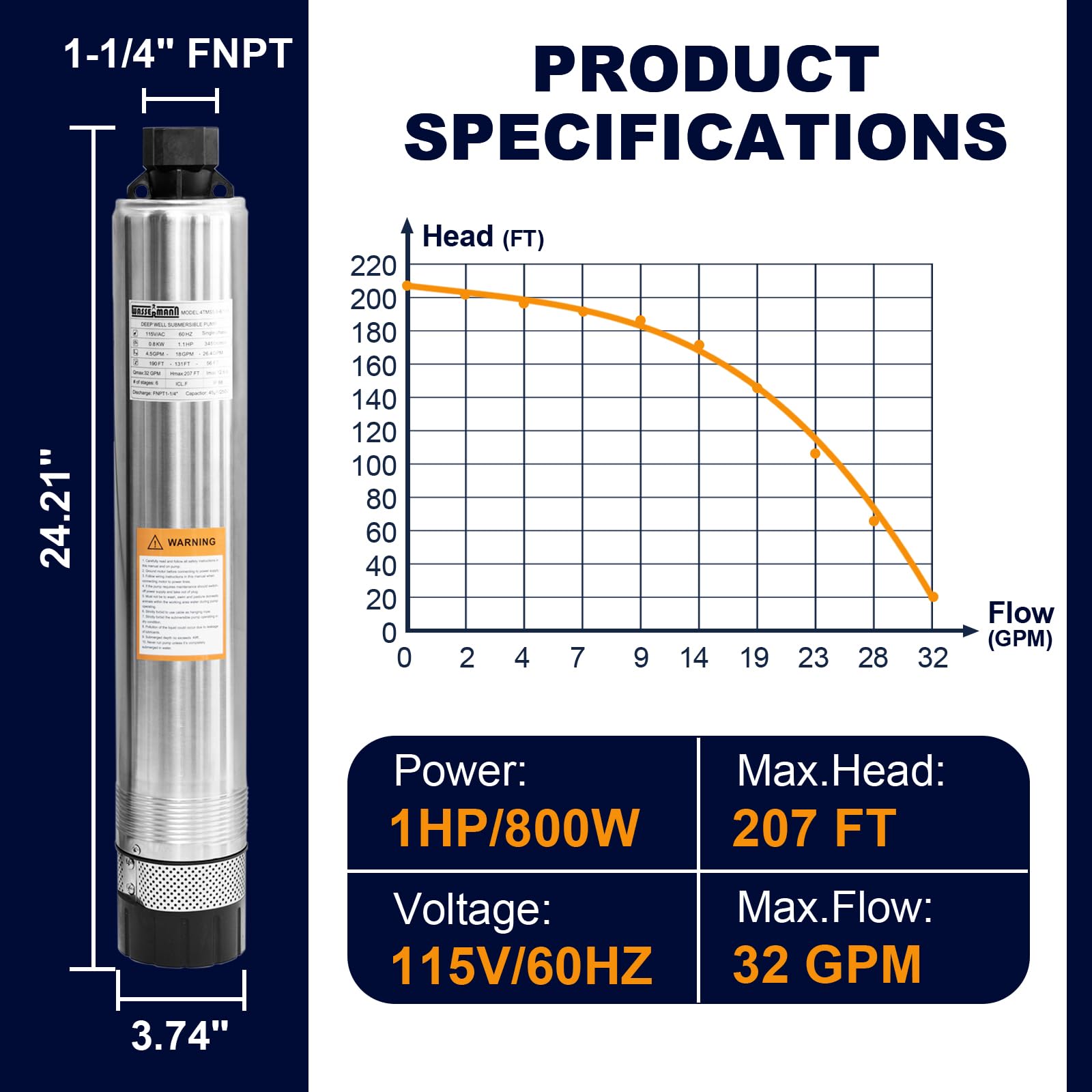 - 【ESSENTIAL PARAMETER】Stainless Steel Submersible Deep Well Pump rated voltage: 115V/60HZ;Rated power:1HP;Max flow:32GPM;Max head:207ft;Outlet:1-1/4″ FNPT;For 4 inch well casings and bigger.